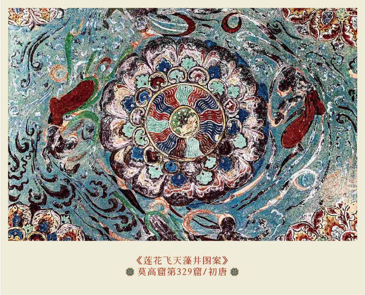 “藻井”约等于我们现在所说的天花板,这幅色彩热烈、变化丰富的藻井图案,是初唐藻井的代表作。