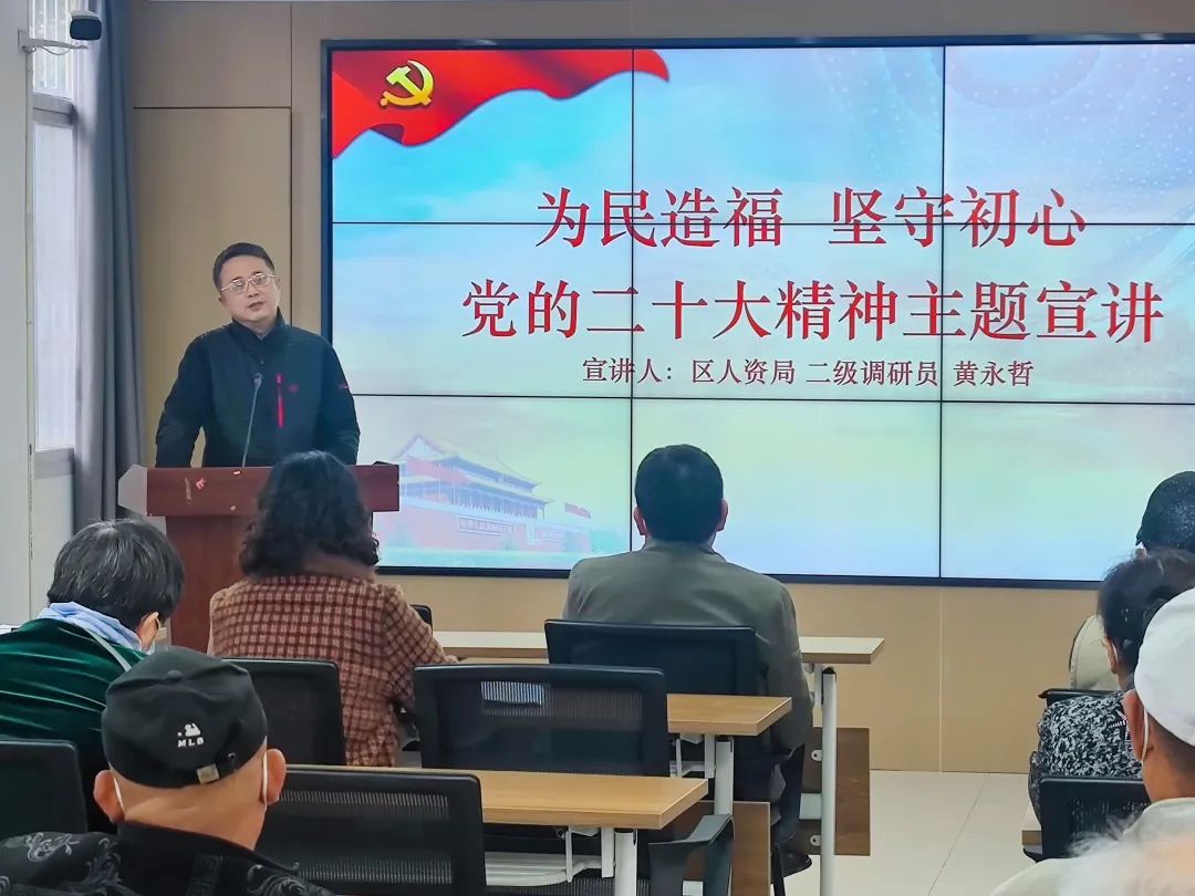 “党的二十大报告中强调,为民造福是立党为公、执政为民的本质要求,必须坚持在发展中保障和改善民生,鼓励共同奋斗,创造美好生活,不断实现人民对美好生活的向往。”下沉单位党员黄永哲以“为民造福 坚守初心”为主题,用通俗易懂的语言解读了党的二十大报告精神,希望大家全面学习、深刻领会党的二十大精神,了解“三个务必”“六个必须坚持”“中国式现代化”“两步走战略安排”“五个重大原则”等新思想、新理念、新战略和新要求,充分认识学习宣传贯彻党的二十大精神的重大意义。