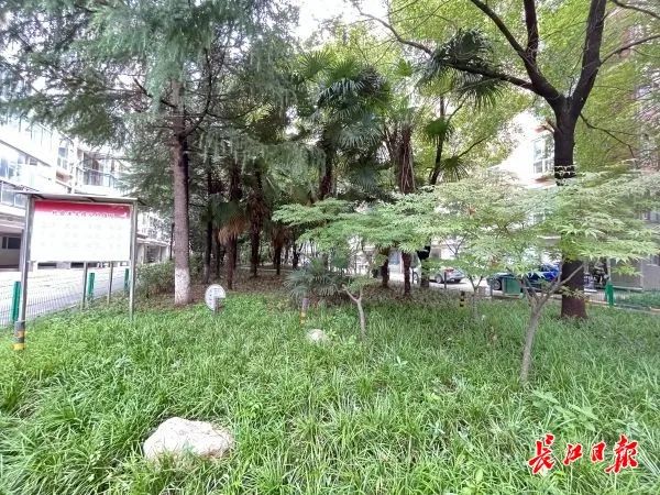 走进健吾公馆小区,能看见沿着院墙边有一条宽3米、长100多米的破损石板路,紧挨石板路是宽4米的绿化带,里面杂草丛生。