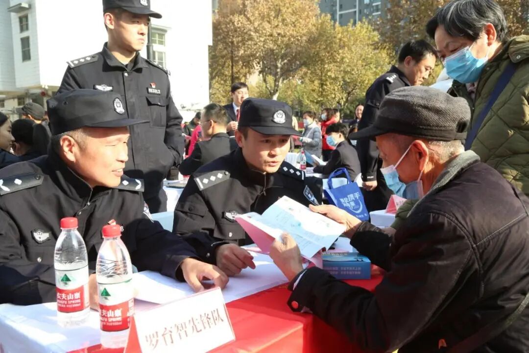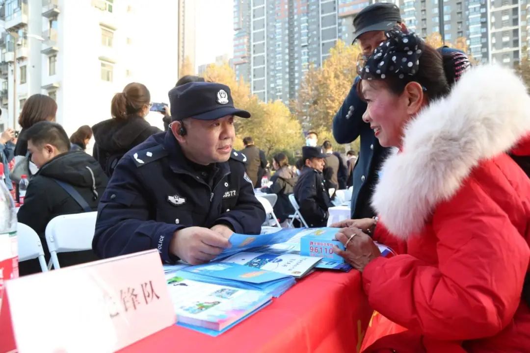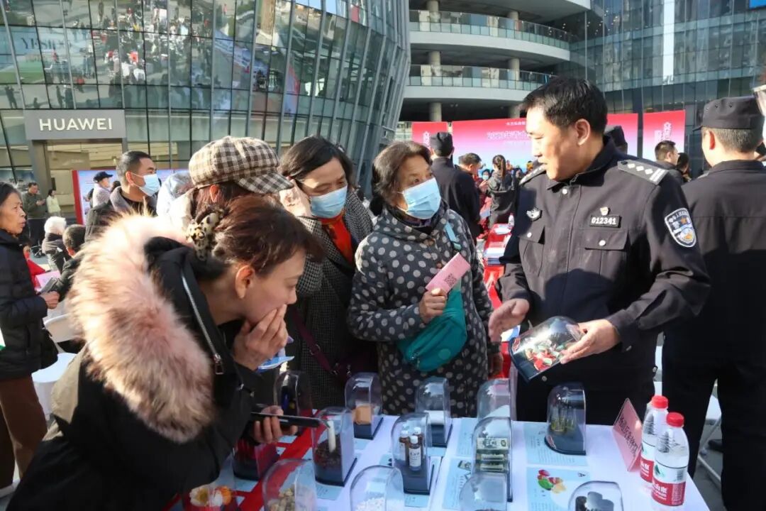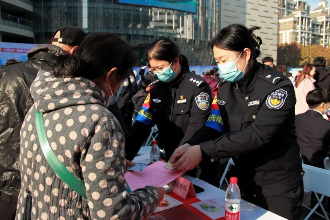 市公安局禁毒支队“杨道兵先锋队”摆设展台,向群众展示三十余种新型毒品模型,发放禁毒宣传资料。展区旁边,四辆警用特种车辆整齐摆放,多种型号的警用枪械,吸引了不少群众驻足体验。青山区委政法委“谢玲先锋队”现场推广“法指针”小程序,帮助居民注册,耐心讲解使用方法,进一步拓宽群众化解矛盾纠纷线上渠道。