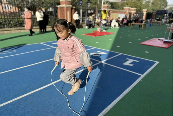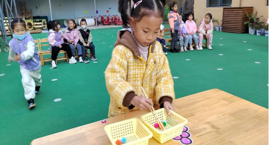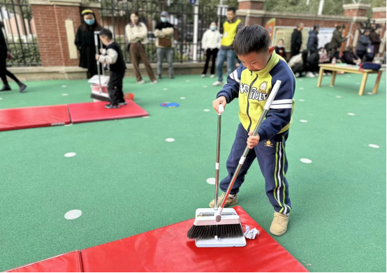 大班小朋友们就更厉害了,他们要把筷子夹毛球、倒水、整理书包、扫地、叠被子这五项劳动技能和运动项目相结合,挑战时争分夺秒,一系列动作干脆利落,俨然一个个自信大方的小学生。