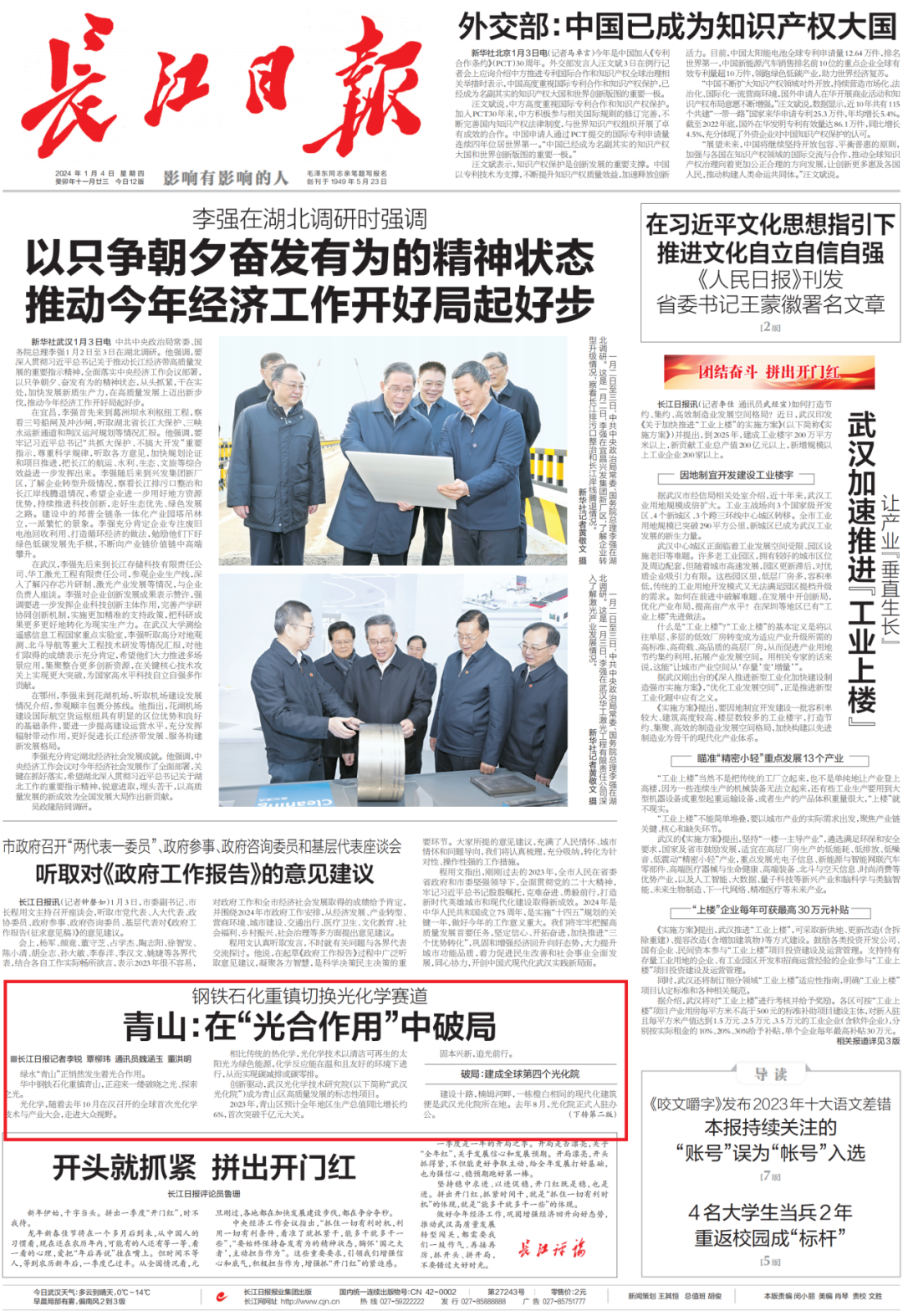 1月4日,长江日报头版以《钢铁石化重镇切换光化学赛道青山:在“光合作用”中破局》为题,关注青山在转型之路上固本兴新、追光前行的脚步。