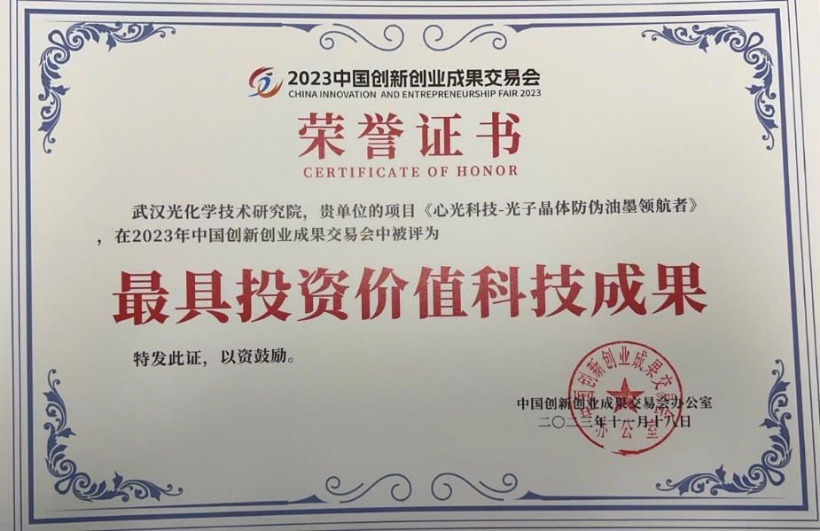 在去年11月举行的2023中国创新创业成果交易会上,武汉光化院的项目《心光科技—光子晶体防伪油墨领航者》被评为最具投资价值科技成果,可有效提升印刷品防伪效果。