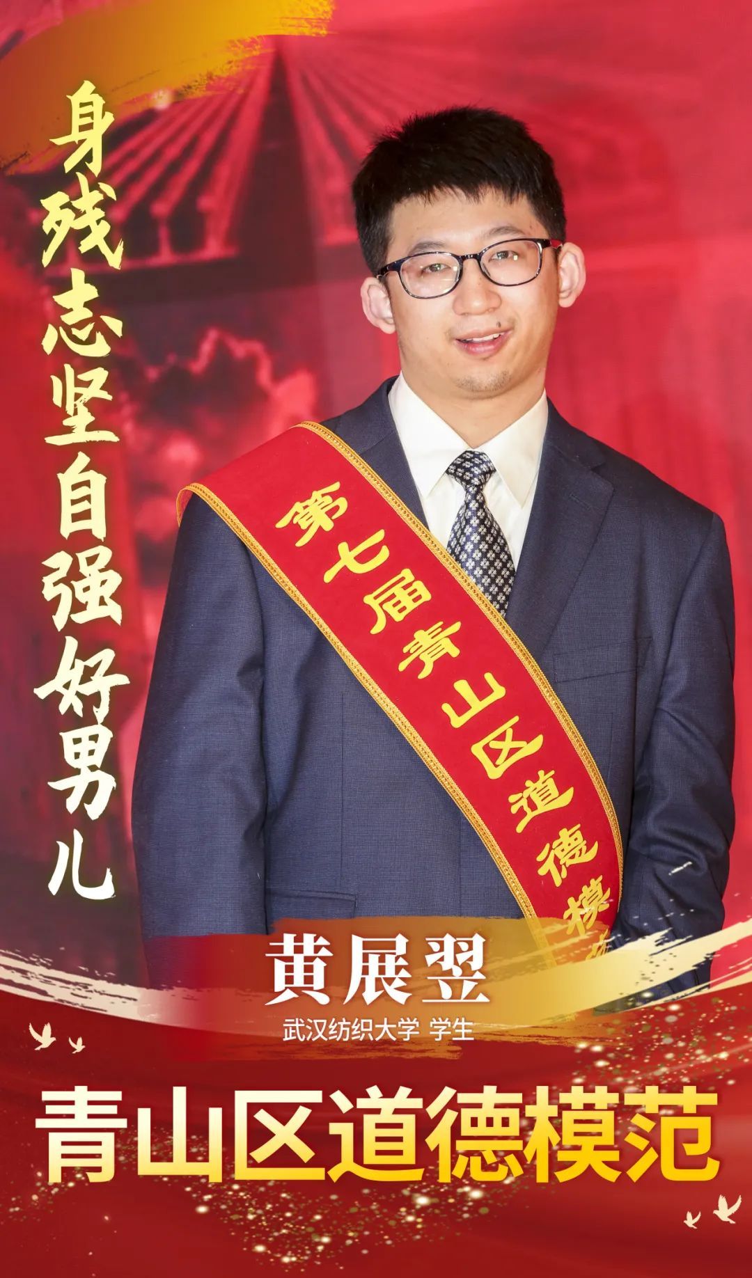 因出生时窒息被诊断为脑瘫,肢体二级残疾,但他从未因此放弃学习的机会,付出比常人多十倍甚至百倍的努力。2018年黄展翌以优异成绩被武汉纺织大学录取,考研本校又一战成功。他在校期间获得了多个竞赛奖项、荣誉和奖学金,学院成立了以他名字命名的志愿服务队。《楚天都市报》《长江日报》《中新网》《极目新闻》等媒体多次报道了他的励志事迹。