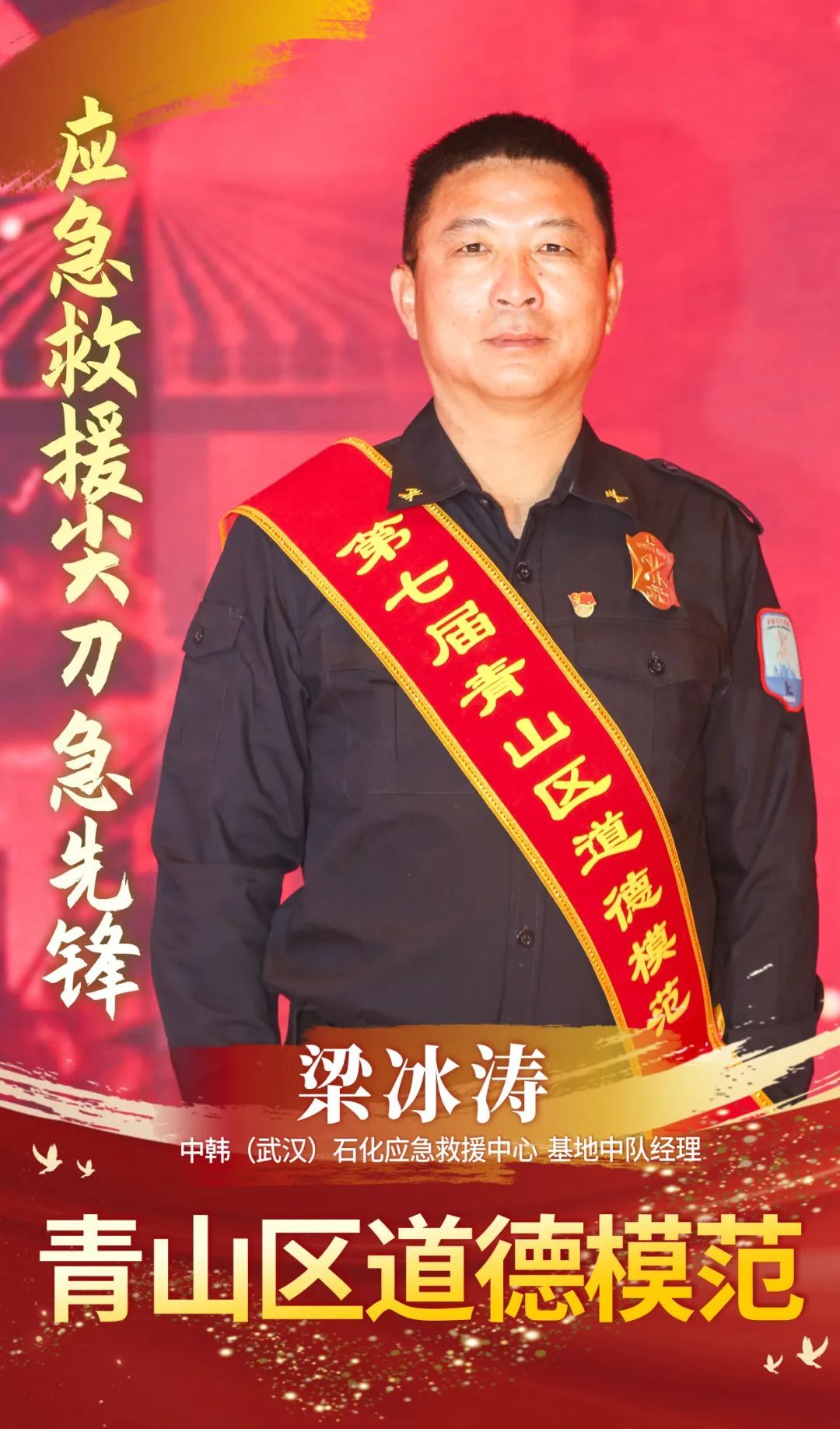 梁冰涛,男,1974年10月出生,中共党员,中韩(武汉)石化应急救援中心基地中队经理。