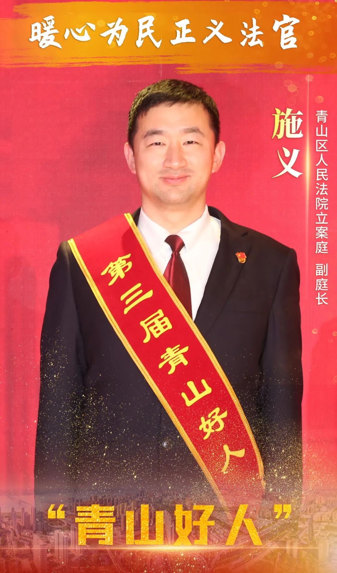 施义,男,1982年7月出生,中共党员,青山区人民法院立案庭副庭长,速裁团队负责人,一级法官。