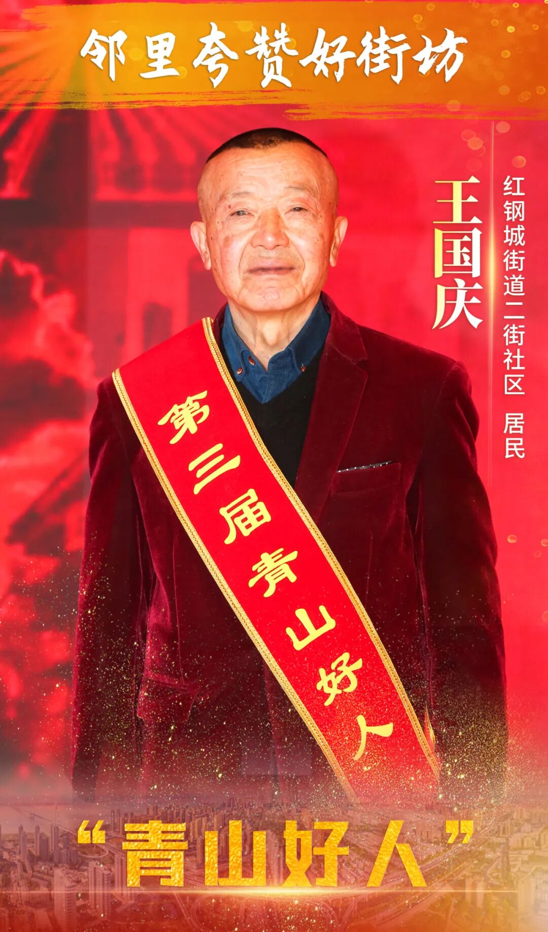王国庆作为社区橙色“好街坊”志愿服务队的队长,协助社区开展疫情防控志愿服务,化解邻里矛盾纠纷,协调帮办民生问题、走访照顾困难老人、招募组建文化团队,积极发扬“好街坊”邻里守望和互帮互助精神,用耐心、爱心,诠释一名志愿者奉献他人、不计回报、服务社会的大爱。曾获得青山区“五好”榜样人物、2022年度“武汉市最美志愿者”等荣誉称号。