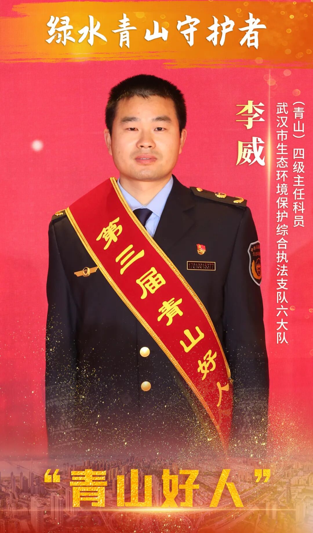李威,男,1988年1月出生,中共党员,武汉市生态环境保护综合执法支队六大队(青山)四级主任科员。