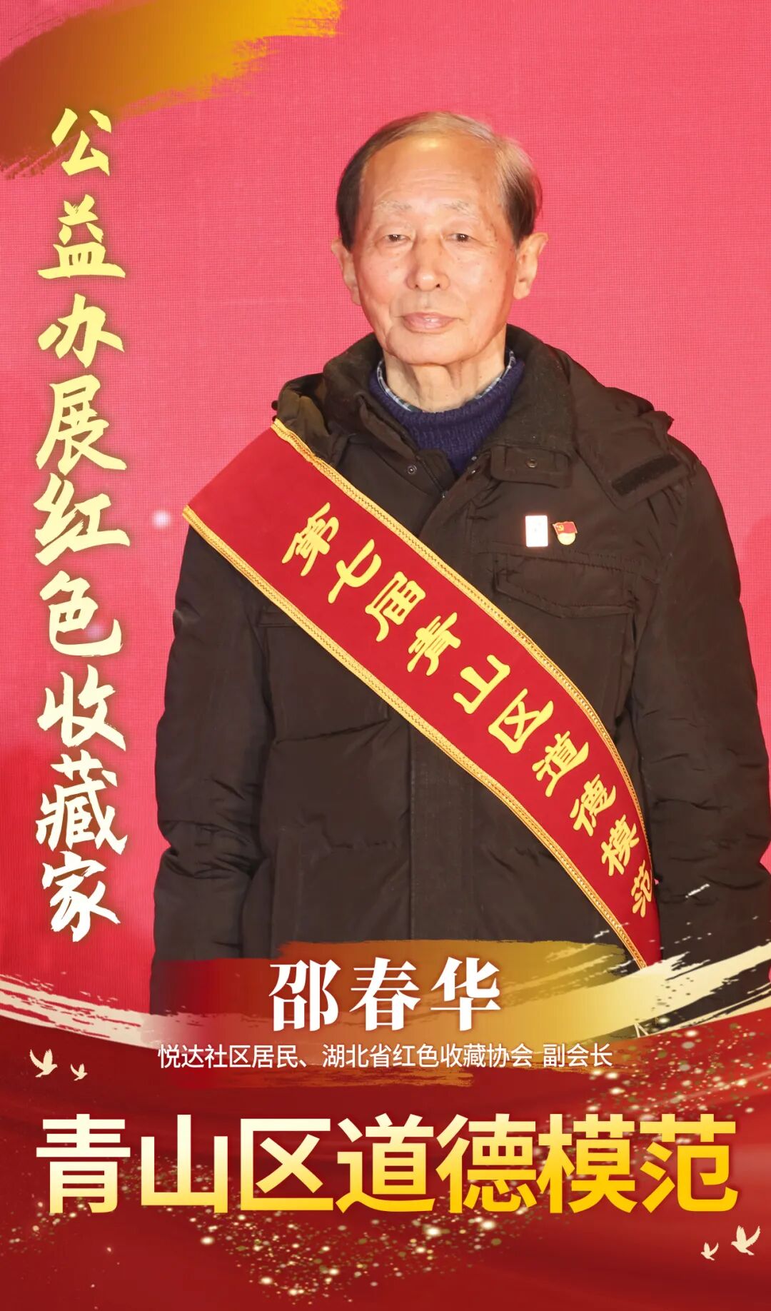 他是热衷于推广雷锋精神和红色文化的“红色收藏家”,退休后,他拿出自己30多年来收藏的8000余件宣传画、报刊、像章、邮票等红色藏品,免费办起了公益展览,累计投入十几万元而从不求回报,赓续红色血脉是他的赤诚初心。曾获评“全国红色收藏先进个人”“湖北省收藏家协会红色分会特殊贡献奖”“武汉市文明市民”“青山好人”等荣誉称号。