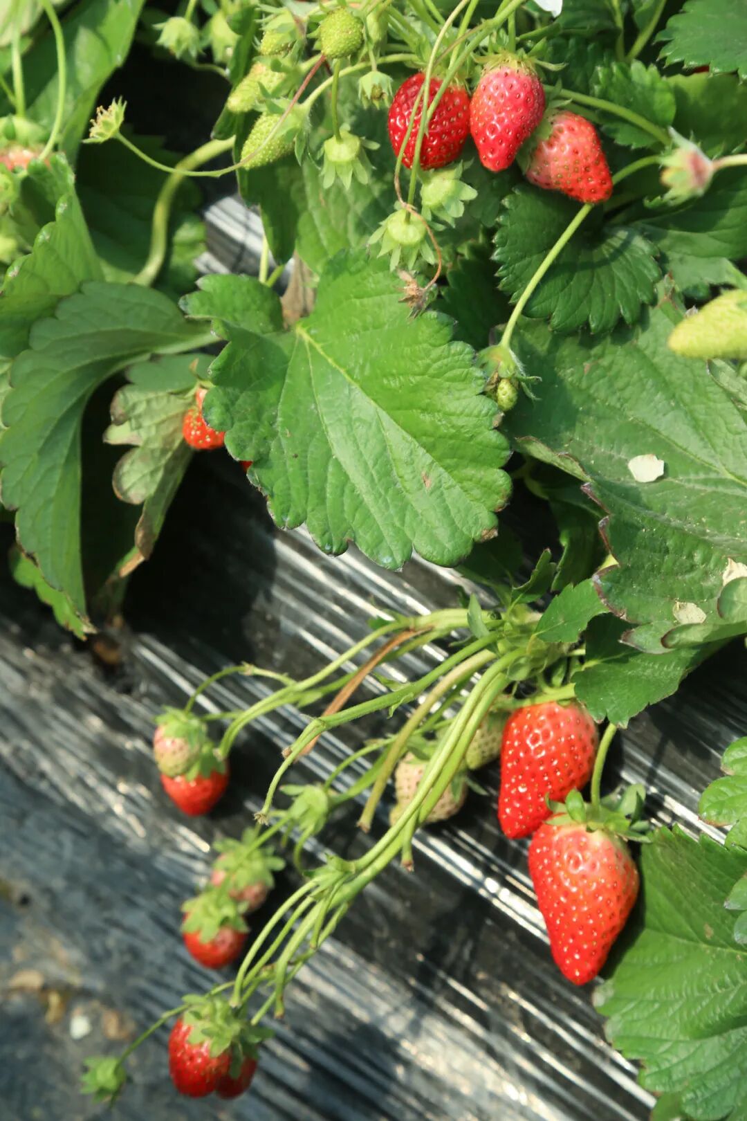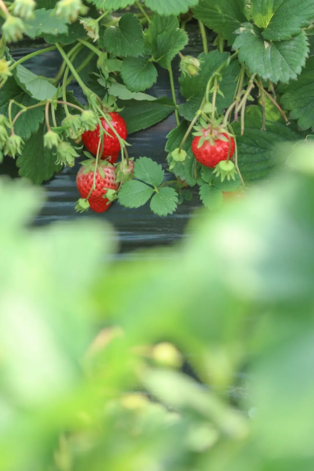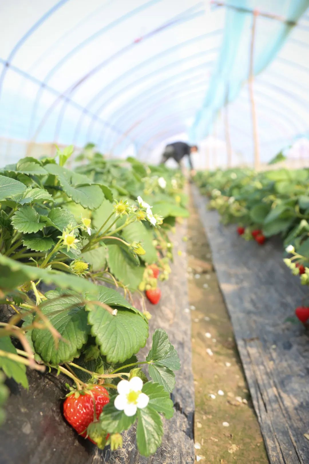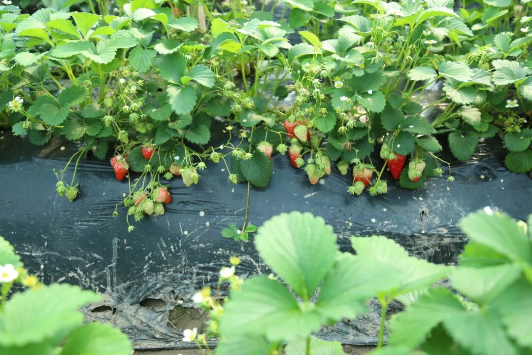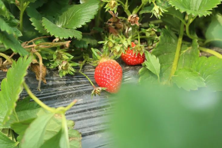 阳光照进草莓棚里,白色小花星星点点,蜜蜂飞来飞去,嫩绿的叶子下挂着红彤彤的草莓,惹人可爱,第三季草莓长势良好,将迎来上市高峰。