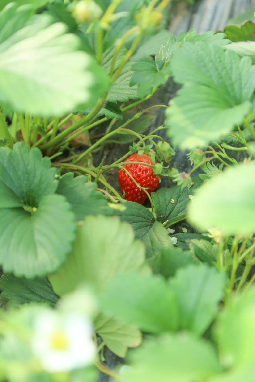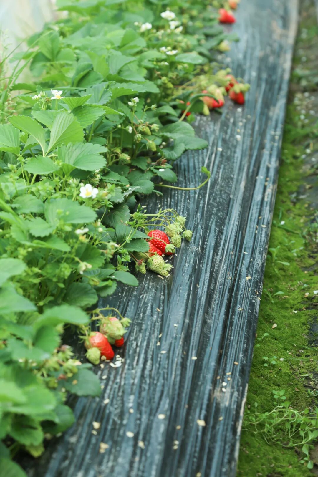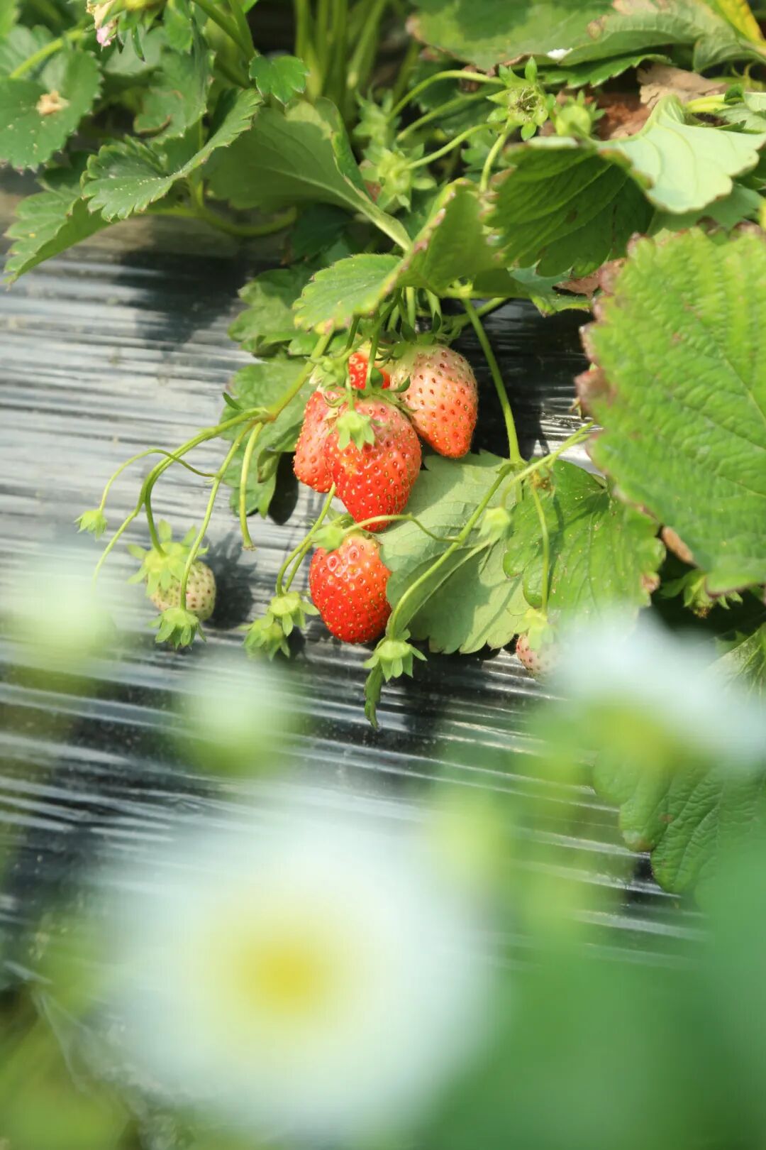 阳光照进草莓棚里,白色小花星星点点,蜜蜂飞来飞去,嫩绿的叶子下挂着红彤彤的草莓,惹人可爱,第三季草莓长势良好,将迎来上市高峰。