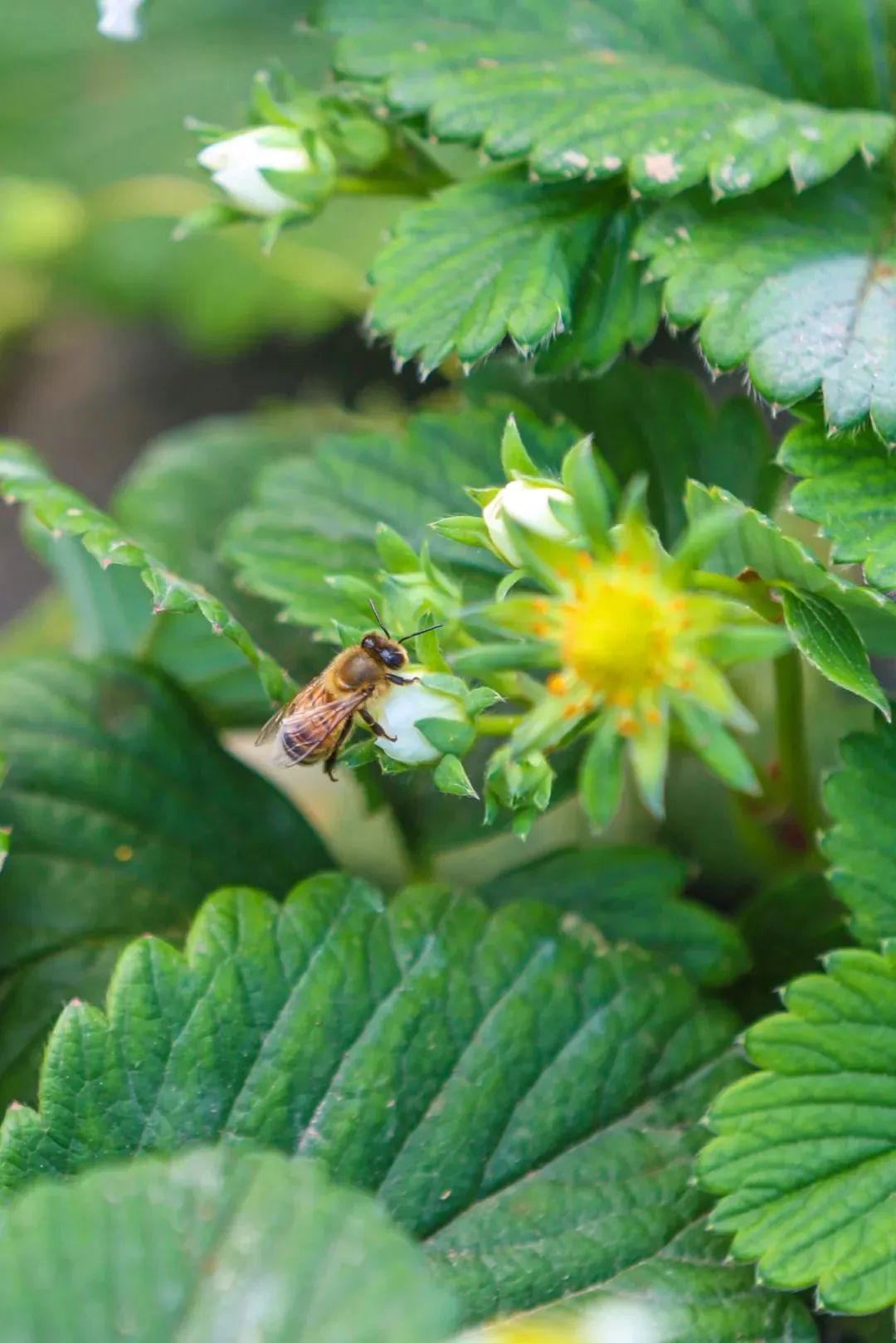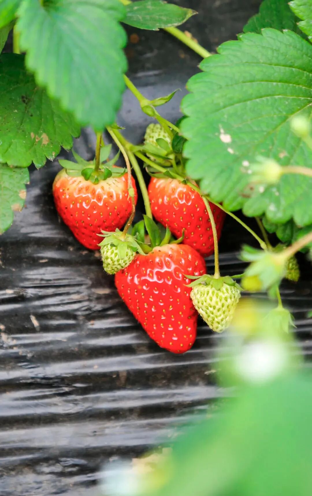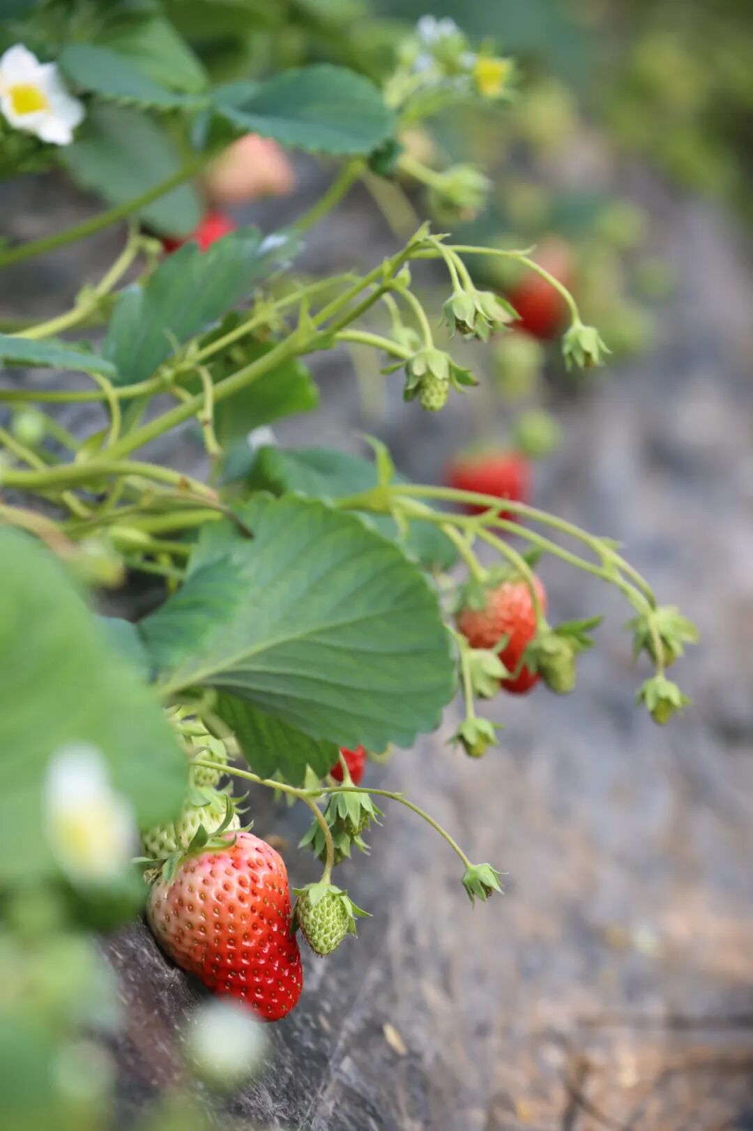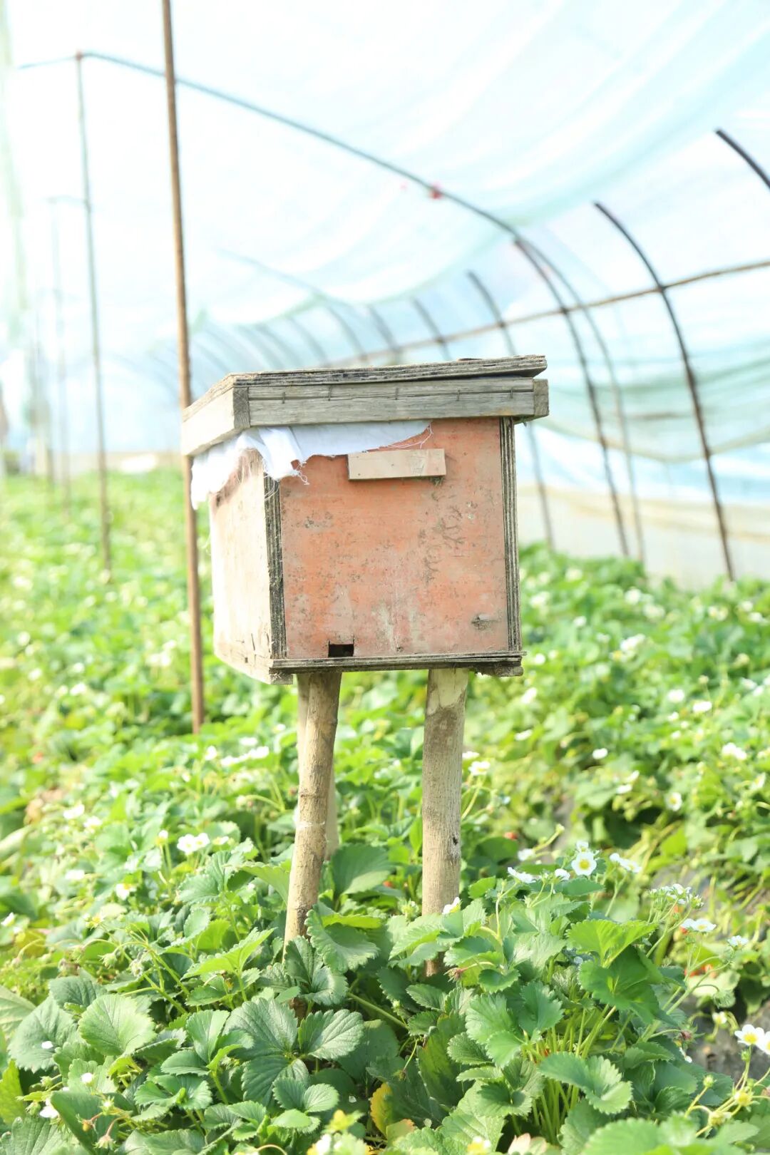 阳光照进草莓棚里,白色小花星星点点,蜜蜂飞来飞去,嫩绿的叶子下挂着红彤彤的草莓,惹人可爱,第三季草莓长势良好,将迎来上市高峰。