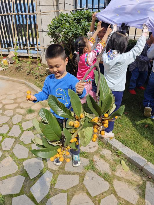 “枇杷从绿色变成黄色了,是不是成熟了?”、“枇杷树那么高,我们怎么摘果子呢?”每天散步时,大二班的孩子们都会望一望园里高高的枇杷树,在期盼中,终于等到了采摘时节。