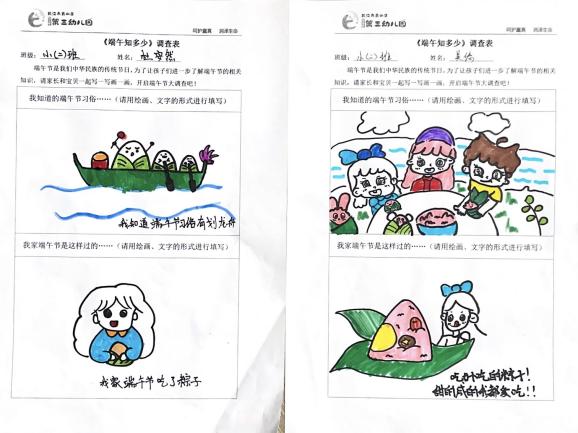 孩子们采取“儿童议事厅”和“问卷调查”的方式,与老师、同伴、家长一起搜索、了解端午节有关知识和习俗,回忆并讨论在家中过端午的方式,最后以绘画表征的形式进行记录、分享。