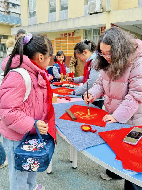 同学们将亲手创作的福字,郑重地送到执勤交警、20路公交司机、保安叔叔、食堂阿姨们手中。一句朴实的“您辛苦了”,定格下感恩与致敬的温暖瞬间。401班学生汪霈柠有感而发:“亲手写福、送福给守护我们的交警叔叔,我心里暖暖的,新学期我也要做乐于助人的小雷锋!”
