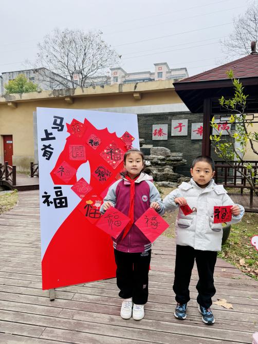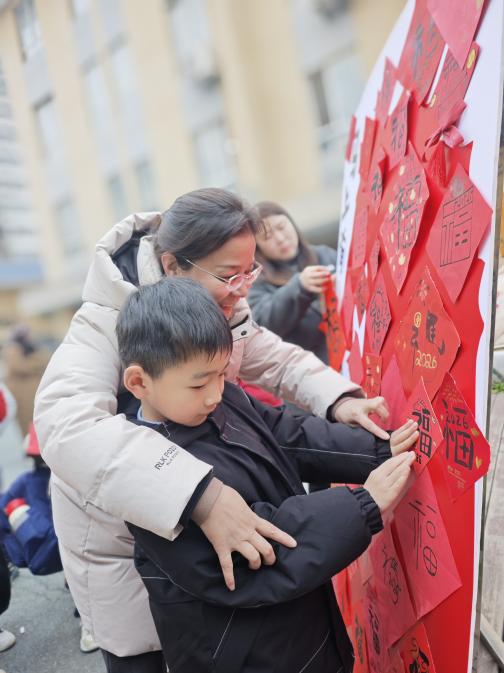 学校门口的“马上有福”主题展板前,同学们带着假期里精心书写的福字,认真粘贴、细心排布,一撇一捺尽显专注,一红一金满是喜庆,让校园瞬间洋溢着浓浓的年味与蓬勃朝气。现场笔墨齐备,师生同台挥毫泼墨,金色福字在红纸上跃然呈现,引得在场同学纷纷驻足围观、掌声连连。